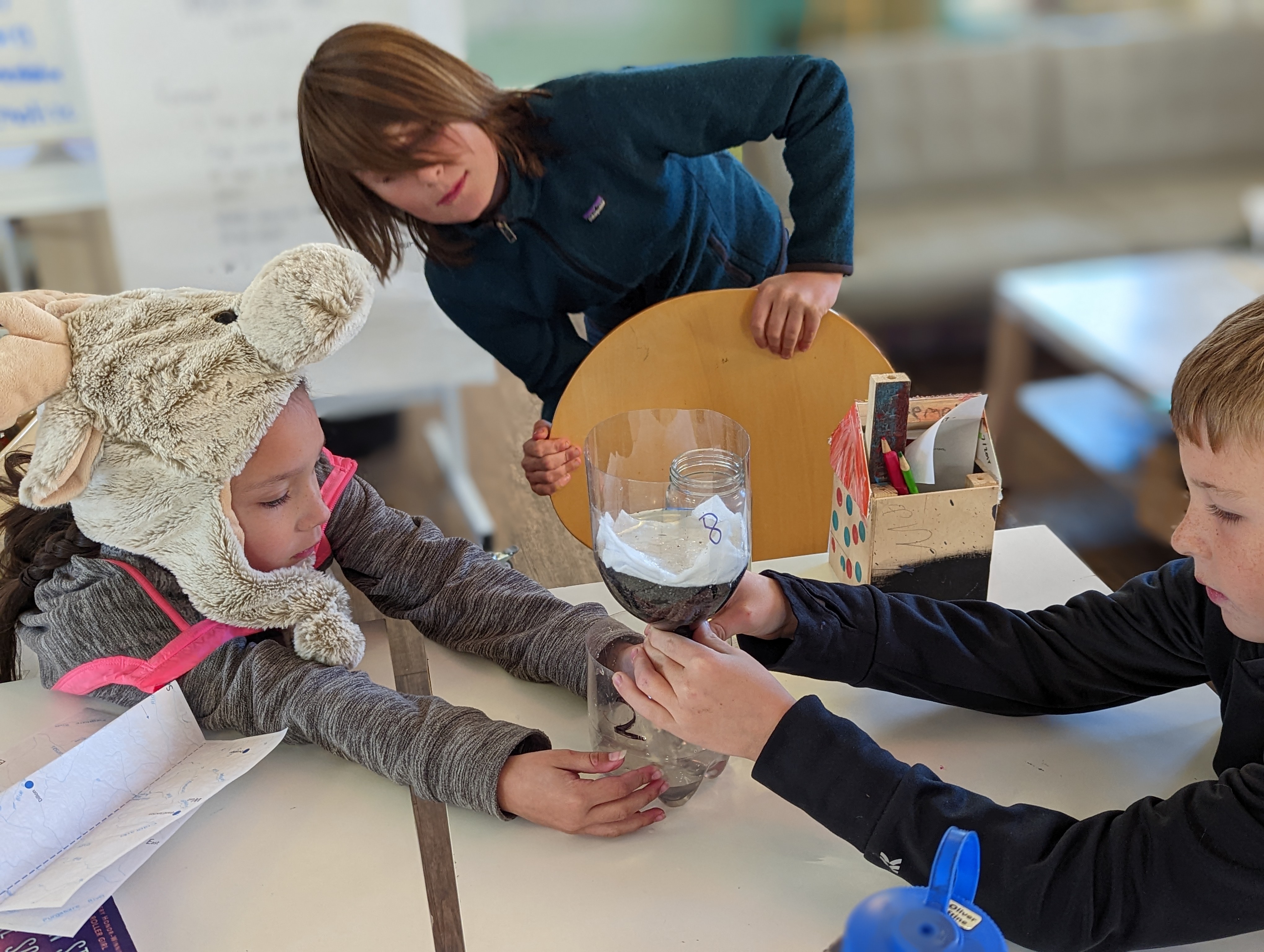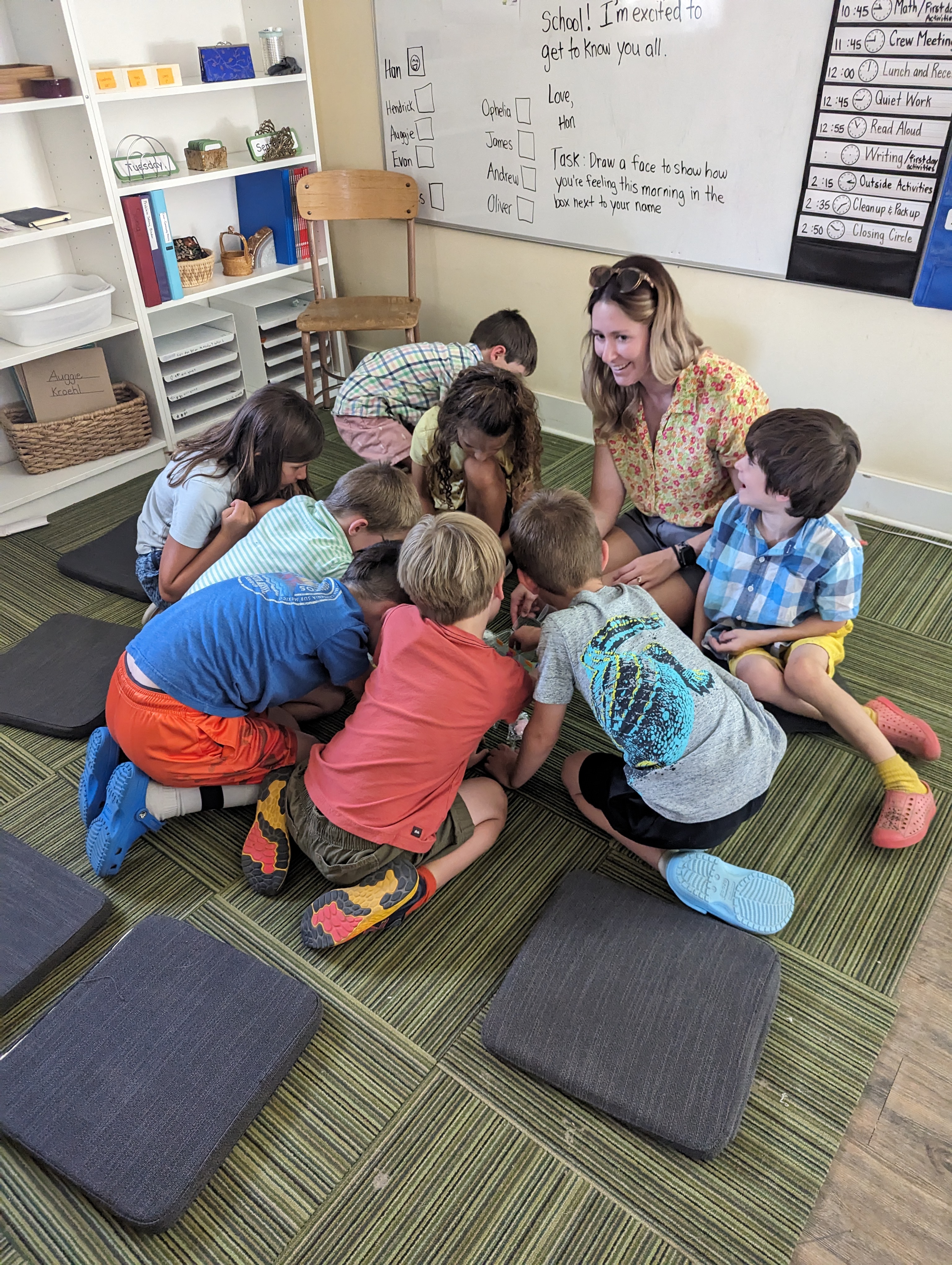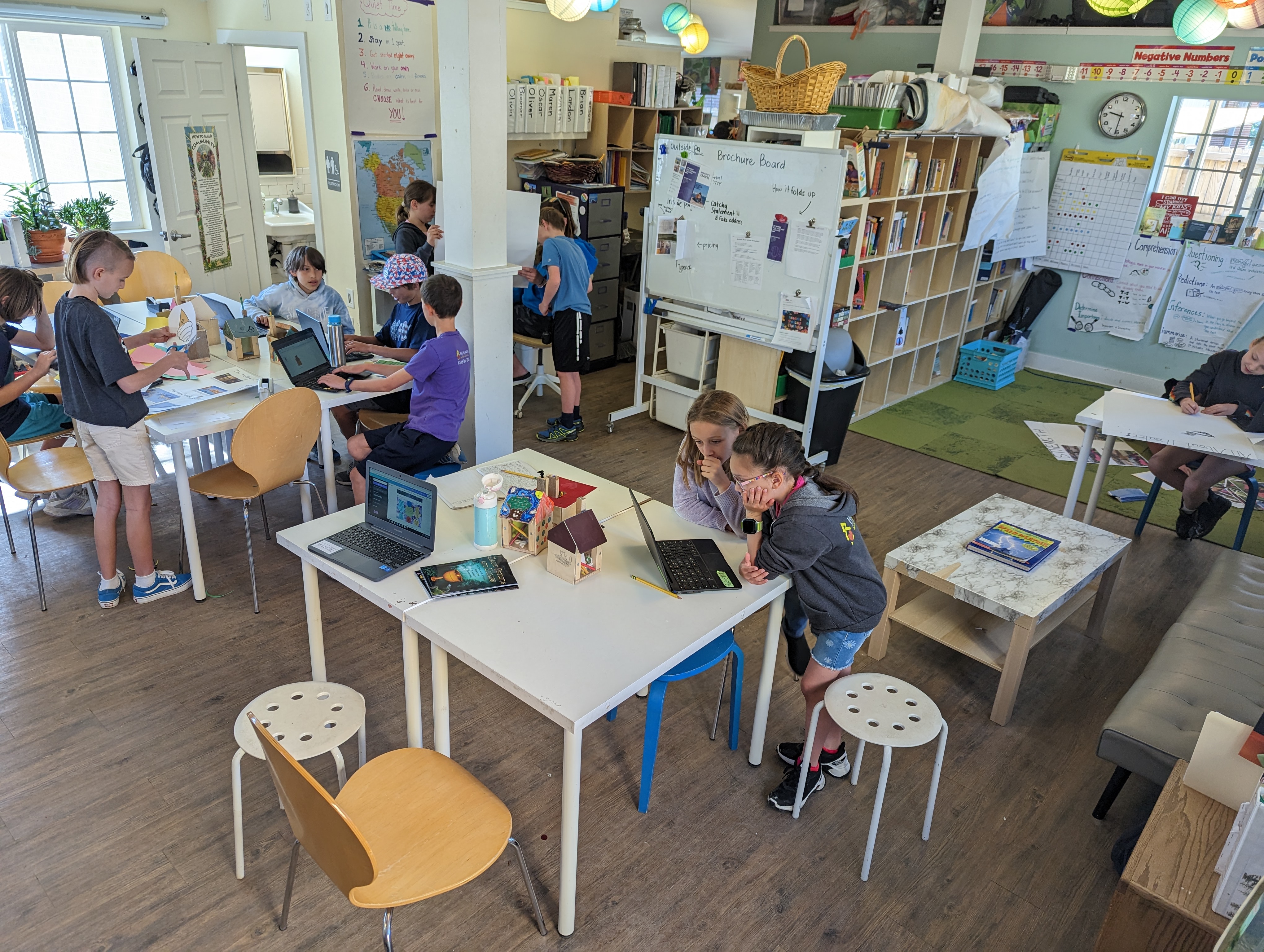 Kindergarten – 2nd Grade Classroom: Our lower elementary classroom features a bright and sunny learning space with versatile work spaces and a designated meeting area that we refer to as “Crew”. Our K-2 students enjoy an ample library, and lots of room to find a cozy quiet corner to settle into some writing or a good book. Han, our lead teacher in this classroom, has a designated meeting space for small group work and there is one communal table that fits all of the students together for whole group work flexibility. It has its own spacious bathroom and is right off of our cubby and kitchen area, which the kids often utilize to heat up their lunches and wash their dishes.