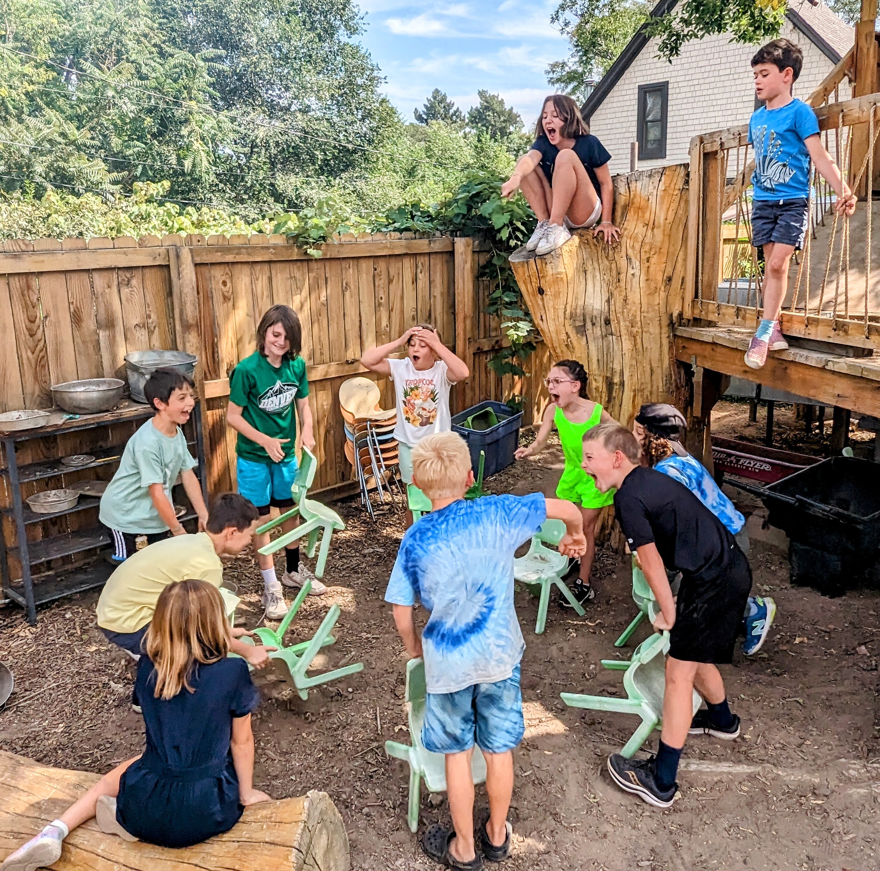 Front Play Yard: You can often spy a rowdy game of soccer with kids of all ages participating and working together in this area. Other popular sports of late have been volleyball and kickball. This space isn’t just for sports, however, as both classrooms like to extend their learning space onto the comfortable AstroTurf and hold a read aloud underneath the shade tree, engage in an important Crew conversation or just play a fun game like Steal the Bacon or Silent Ball. On nice days, Jaime takes her students out here for a yoga class once a week. We also hold many community events on the grass like our annual “Food, Fun and Filanthropy Fair”, Thanksgiving Potluck, and Talent Show.